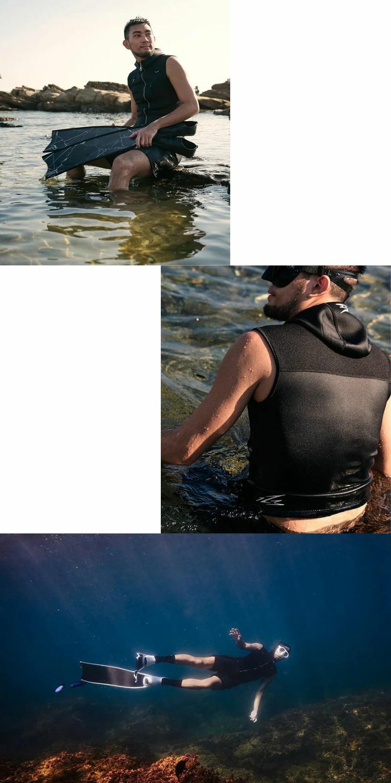 採用兩種防寒衣材質拼接,肩膀使用耐磨布,穿著潛水重裝時減少對防寒衣的摩擦,同時減輕肩膀負擔