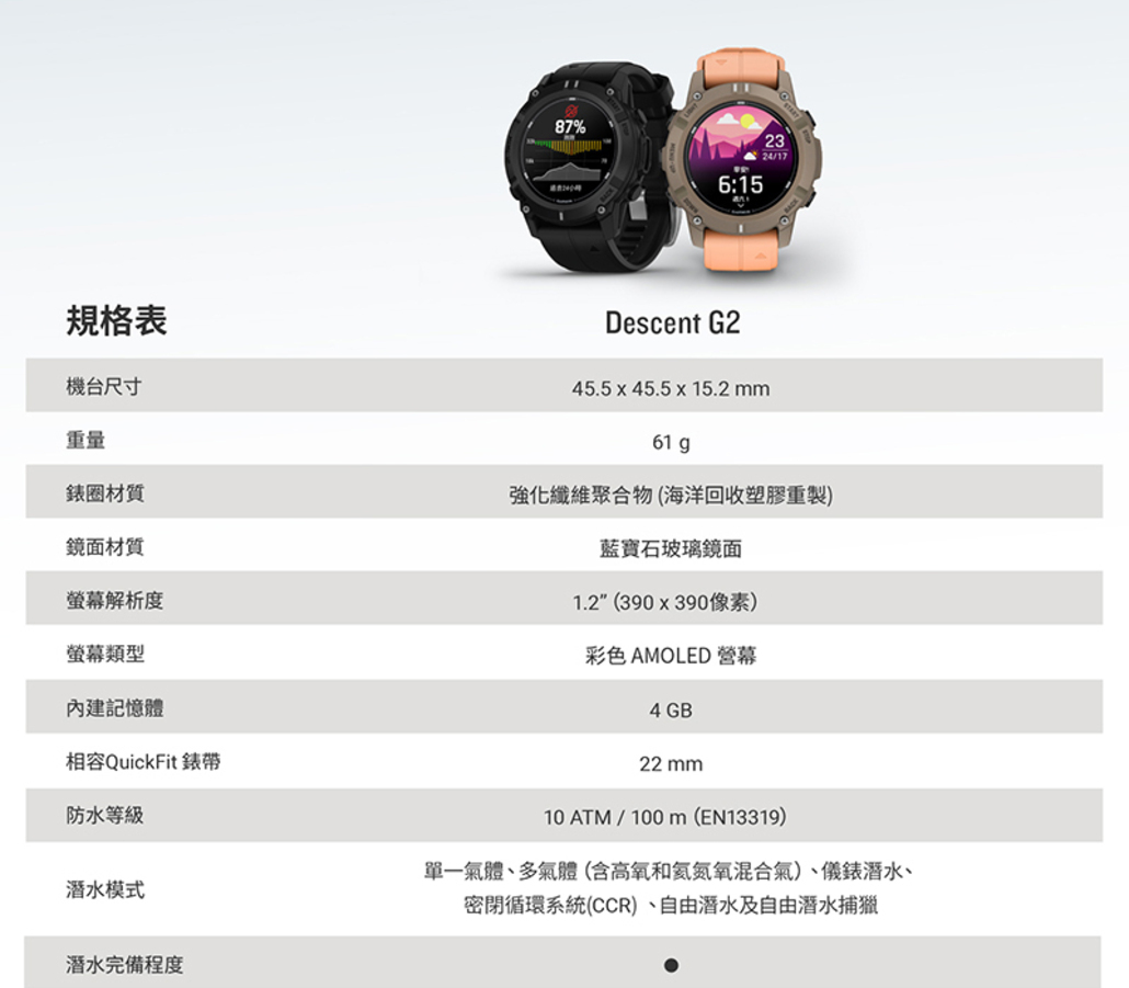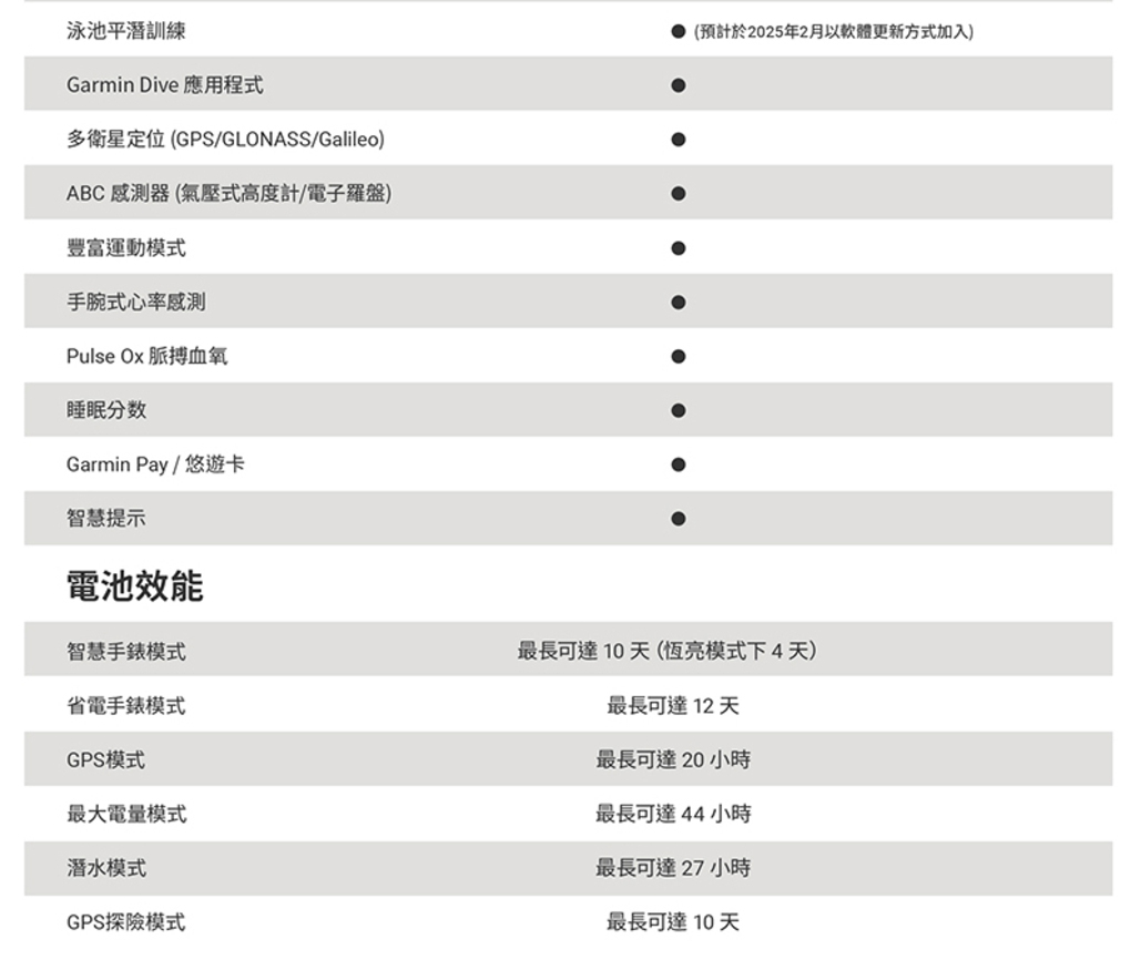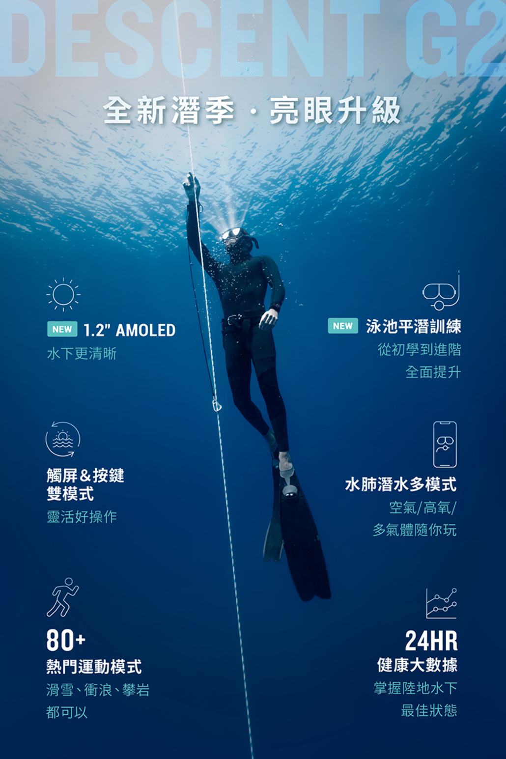 -搭載各種能協助你盡情享受潛水體驗的 Garmin 創新技術,具備複合式運動及智慧功能,滿足你在陸地上的動態生活需求。