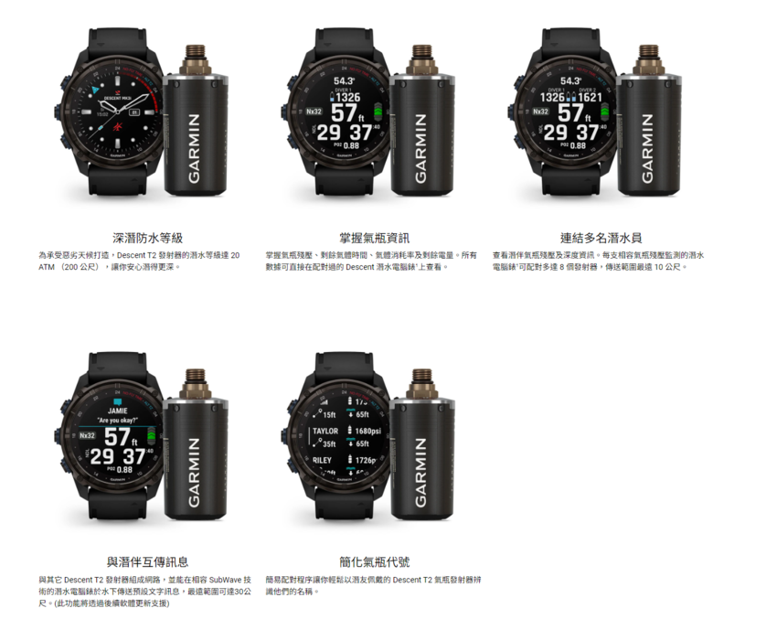 將 Descent T2 發射器與相容氣瓶殘壓監測的Descent潛水電腦錶配對,透過SubWave 潛聲納技術支援可同時監測8個氣瓶,查看潛伴與自己的氣瓶殘壓、深度、氣體消耗量(SAC)與剩餘氣體時間(ATR)。
