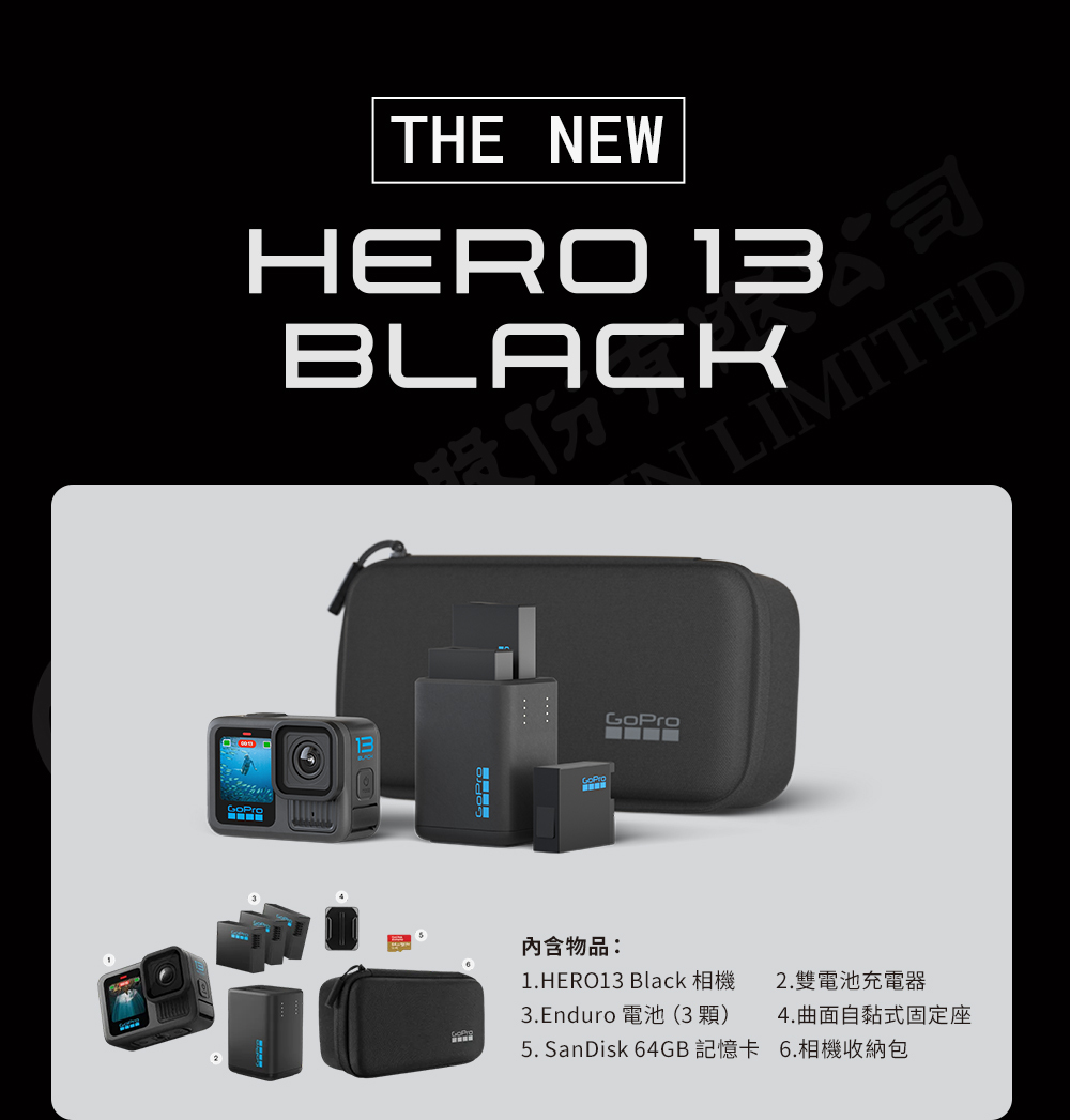 -內含HERO13 Black相機、雙電池充電器、3顆 Enduro電池、一張64GB SD記憶卡和相機收納盒