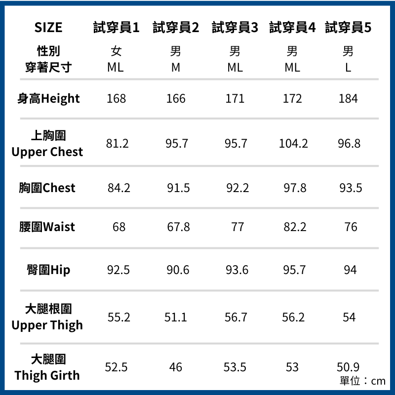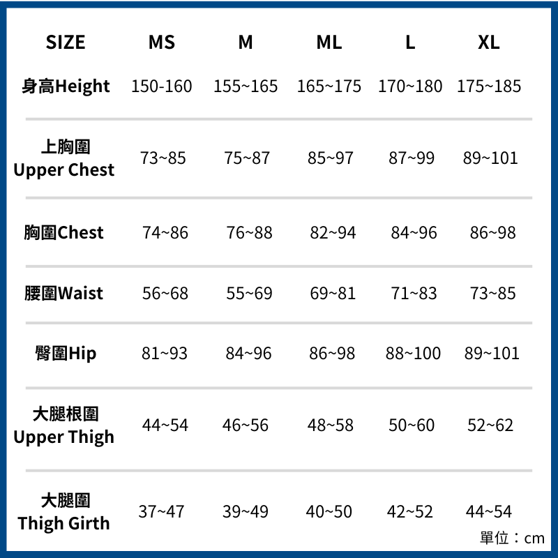 ・建議依據身體圍度為主要參考來選擇尺寸,避免過於貼身或偏小,確保最佳的穿著舒適度與耐用度。