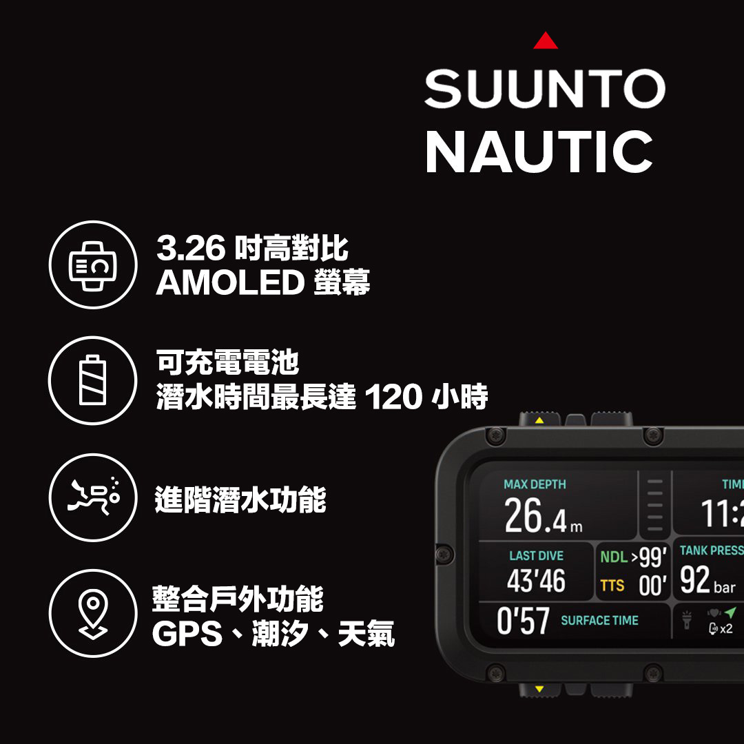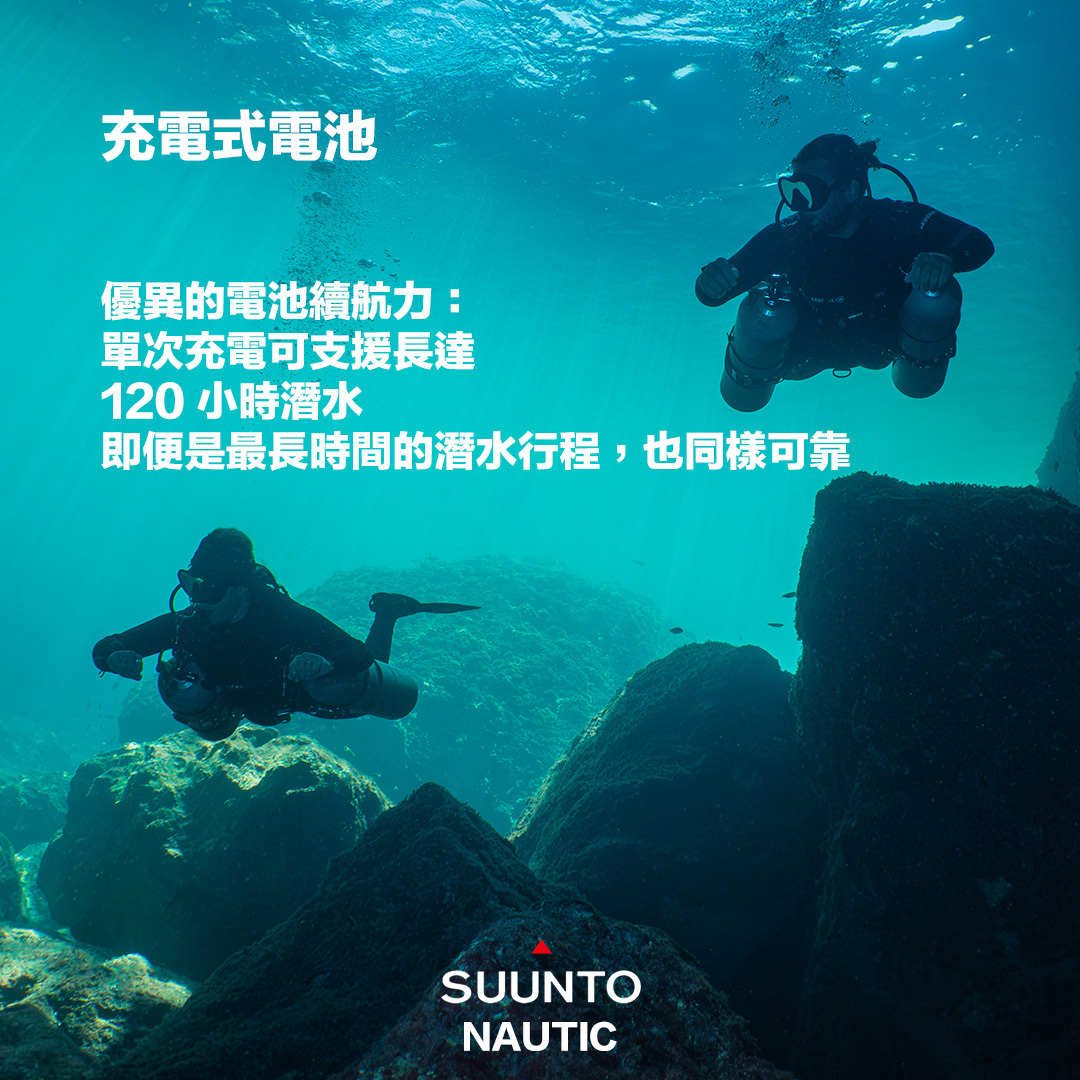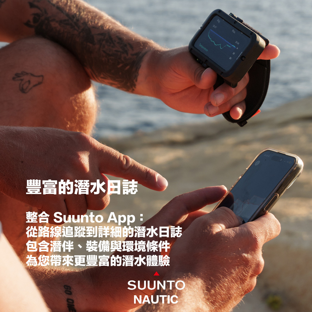 -搭載SUUNTO APP,自動同步潛水日誌與每趟潛水路線,分析潛水表現。