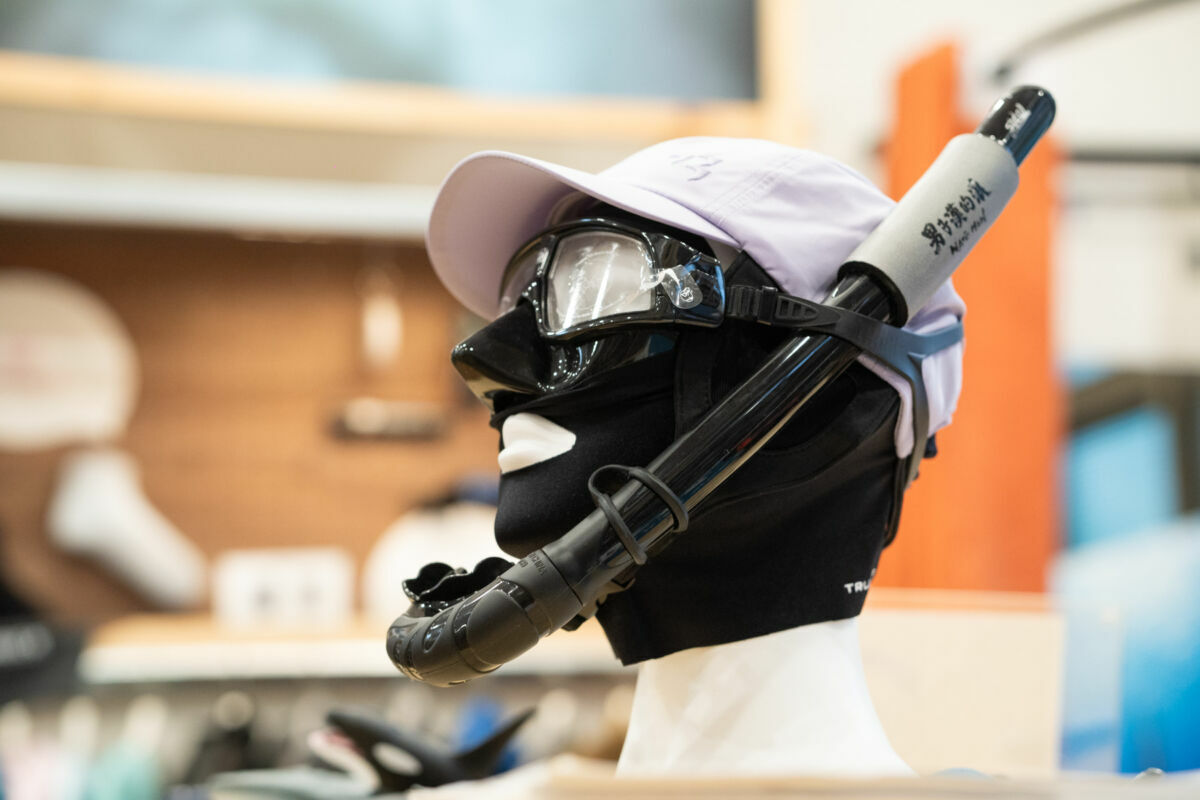 2. 拍照快速卸下法:先將臉基尼戴至脖子,然後戴上帽子,再將面鏡戴上,最後再將臉基尼小開口拉至嘴巴與後端布料拉上至頭頂帽子上。此方式在要拍照時,可以迅速將臉基尼拉下子脖子處,露出臉孔。