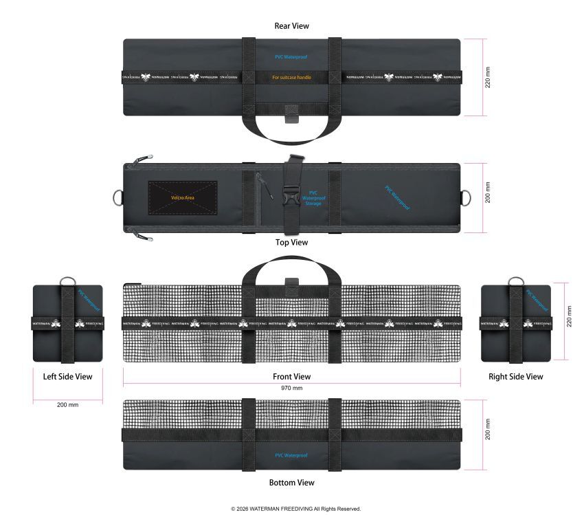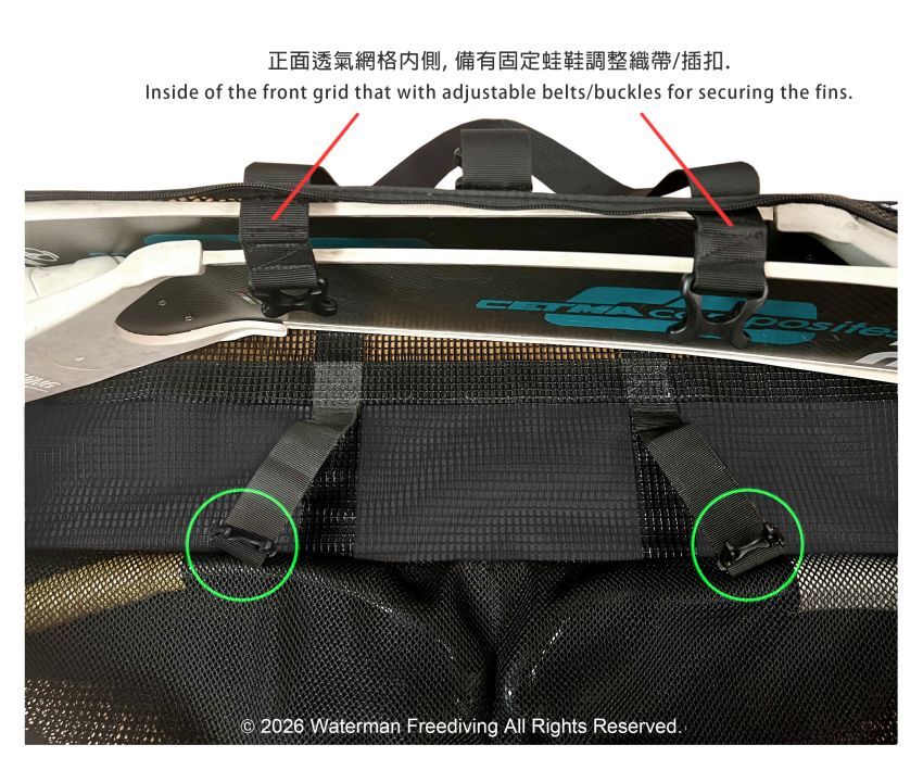 大容量長蛙帶,可收納自由潛水、獵潛長蛙鞋,並可放置防寒衣物及配件裝備等。